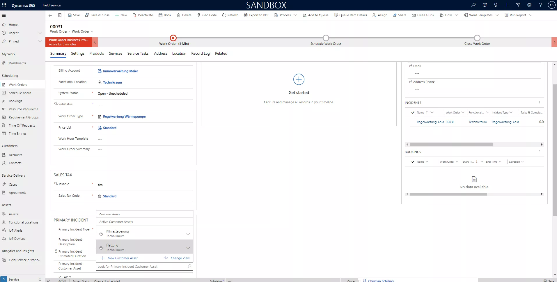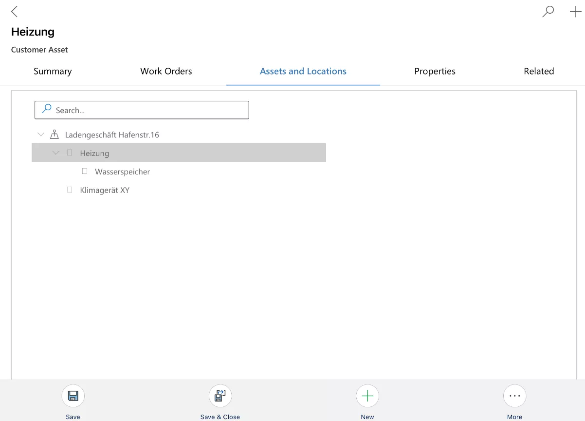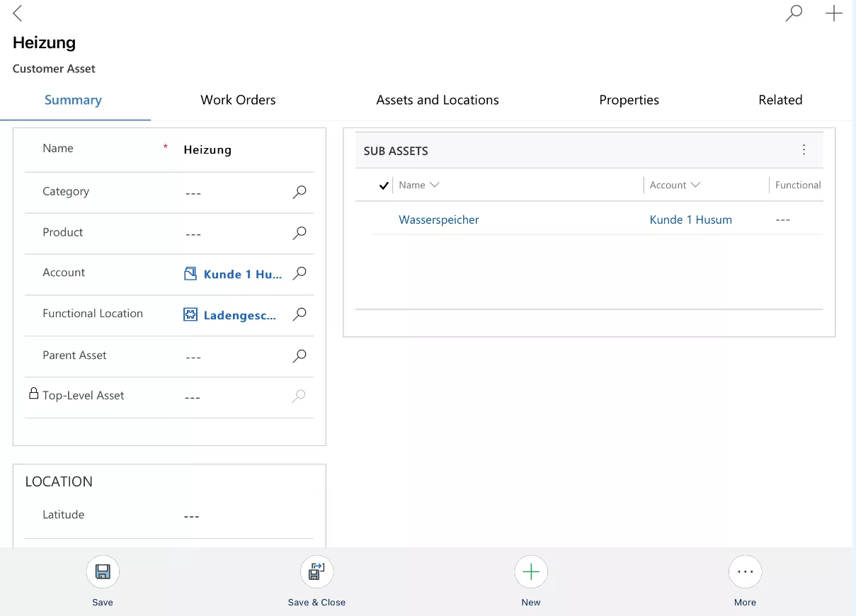 Wer aus einem Arbeitsauftrag in das „Primary Customer Asset“ abspringt, erhält folgende Ansicht: