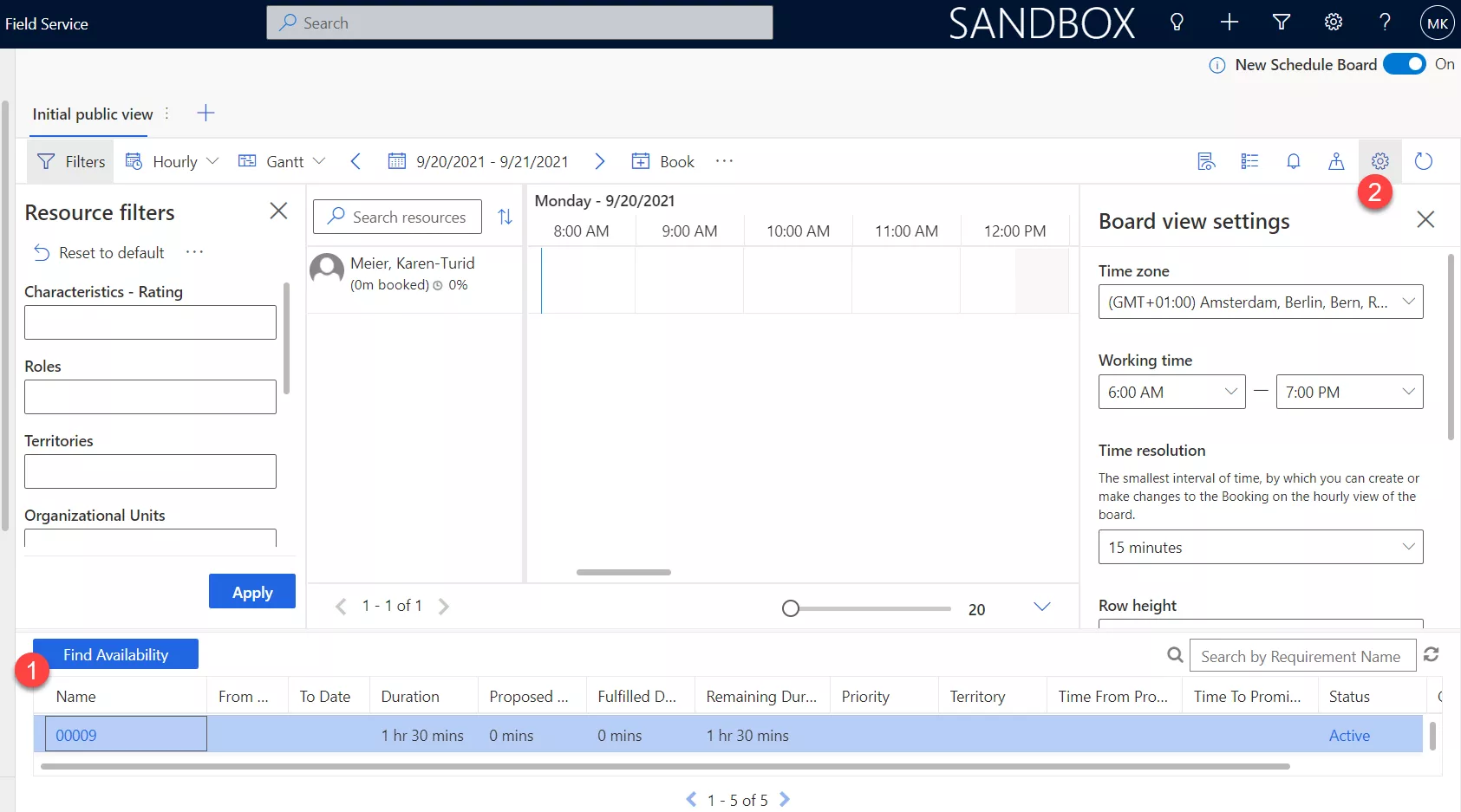 1. den Zeitplanassistenten (in neuem Look) direkt in der Zeitplanübersicht nutzen. Wählen Sie eine Zeile in den Anforderungs-Panels an und es wird ein entsprechender Button angeboten
