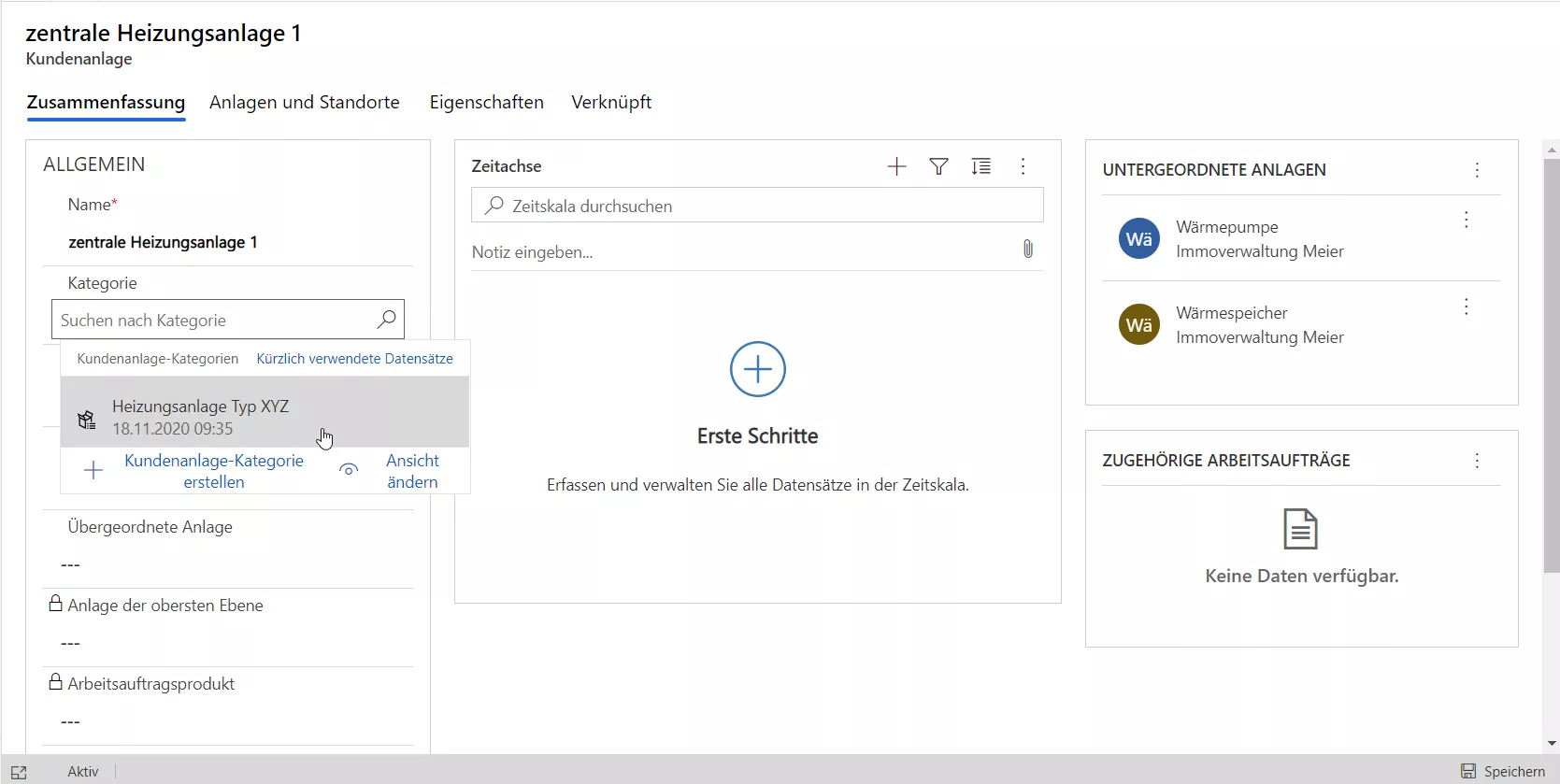 Beim Öffnen einer spezifischen Anlage werden dort zunächst die Stammdaten angezeigt (Reiter „Zusammenfassung“). Diese können Sie individuell erweitern, wenn für ihre Organisation weitere Daten notwendig sind.