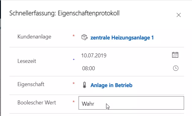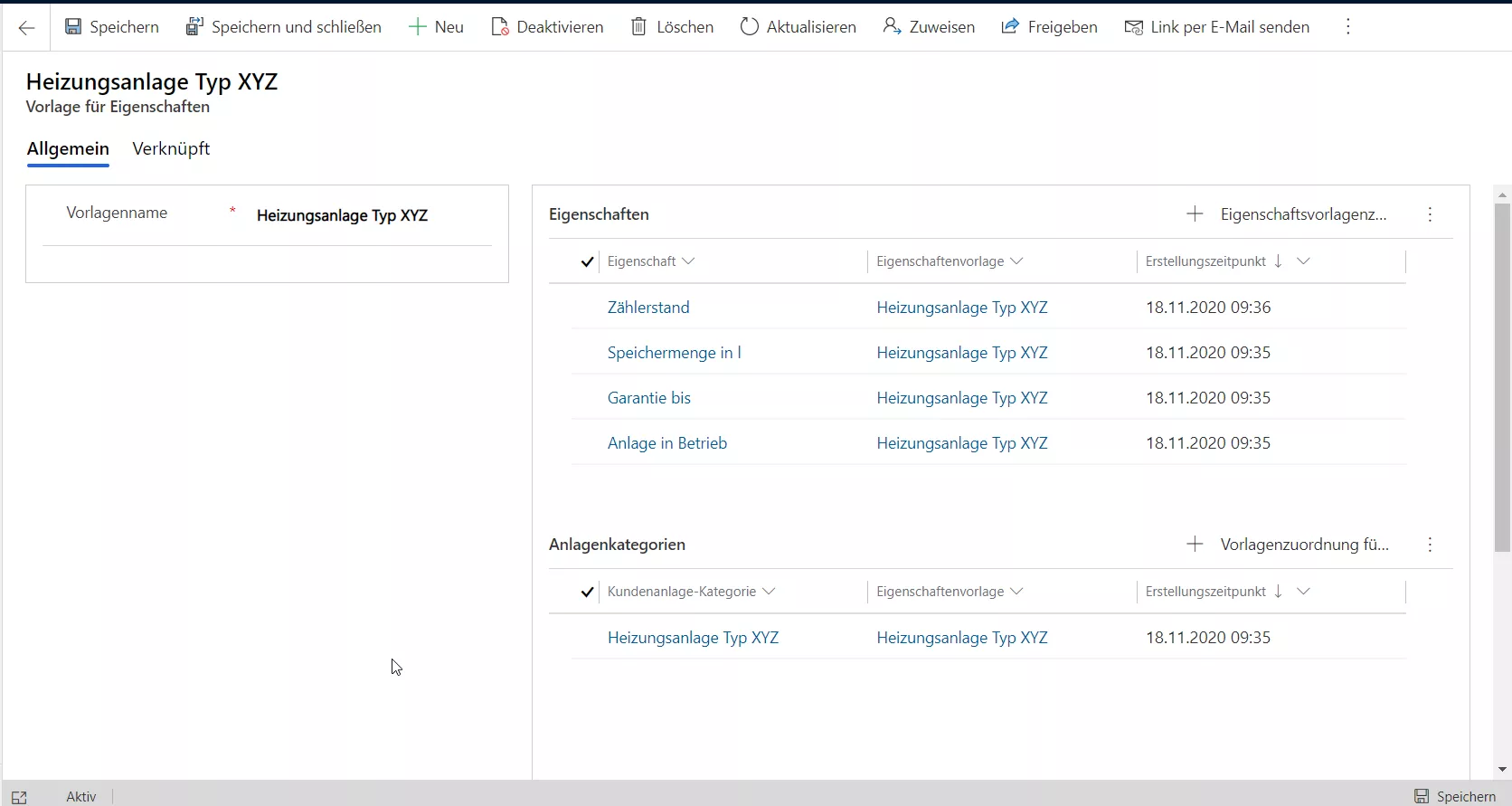 An der Anlage können jetzt die über die Vorlage definierten Eigenschaften erfasst werden.