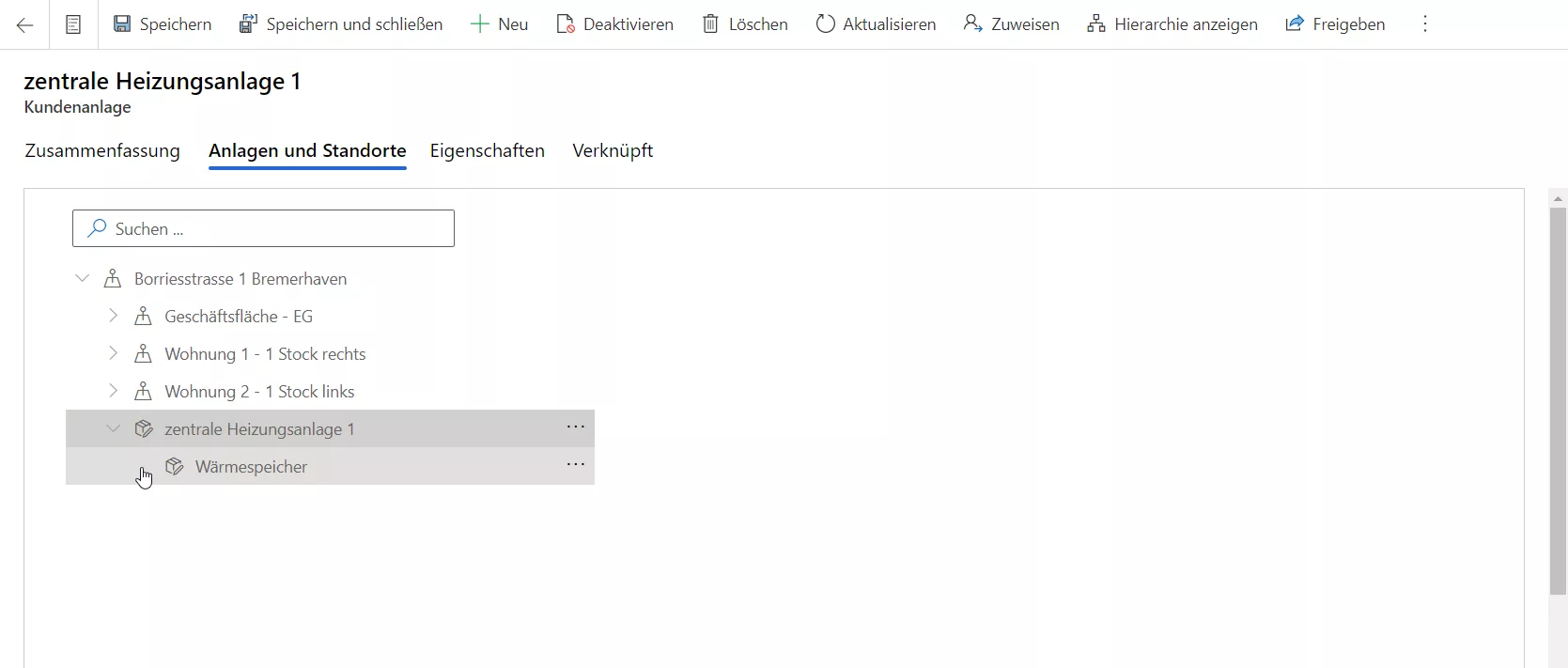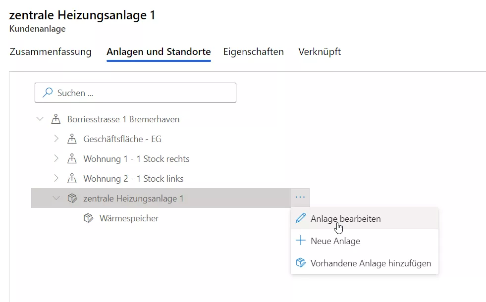 Im Reiter „Anlagen und Standorte“ können Sie zum einen den aktuellen Standort der Anlage (oberste Ebene der Baumstruktur) sehen, zum anderen auch die Struktur der Anlage selbst.