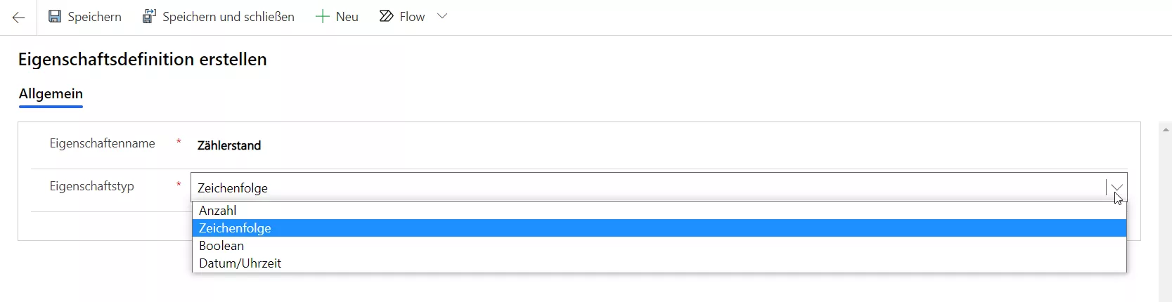 Dies geht ganz einfach: Geben Sie unter „Eigenschaftsname“ eine passende Bezeichnung ein und weisen ihr einen Eigenschaftstyp zu.