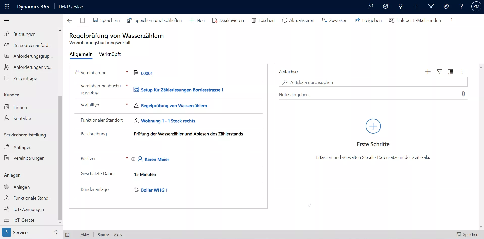 Erstellen Sie ein Vereinbarungsbuchungssetup für eine bestimmte Leistung. Hinterlegen Sie dann in einem sogenannten Vorfall die Anlage, für die entsprechende Tätigkeit ausgeübt werden soll.