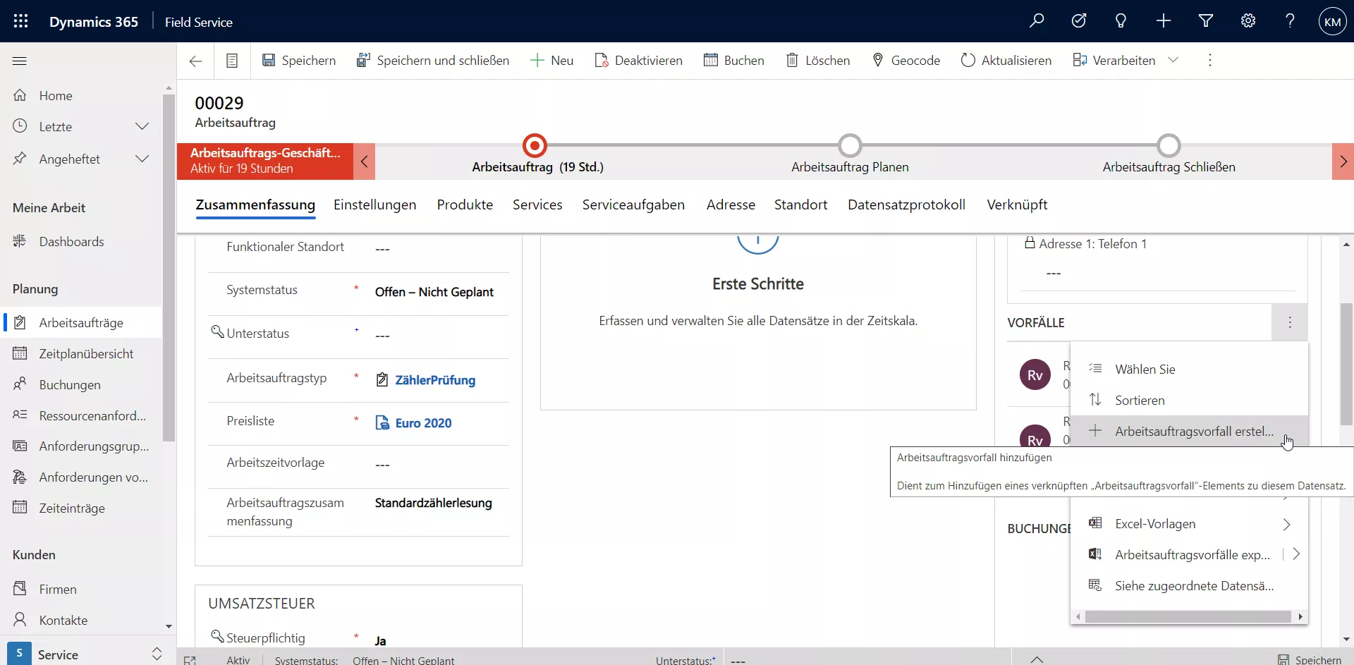 Im automatisch generierten Arbeitsauftrag finden Sie die Vorfälle und damit die einzelnen Anlagen, für die der Techniker in diesem Fall den Zählerstand prüfen soll.