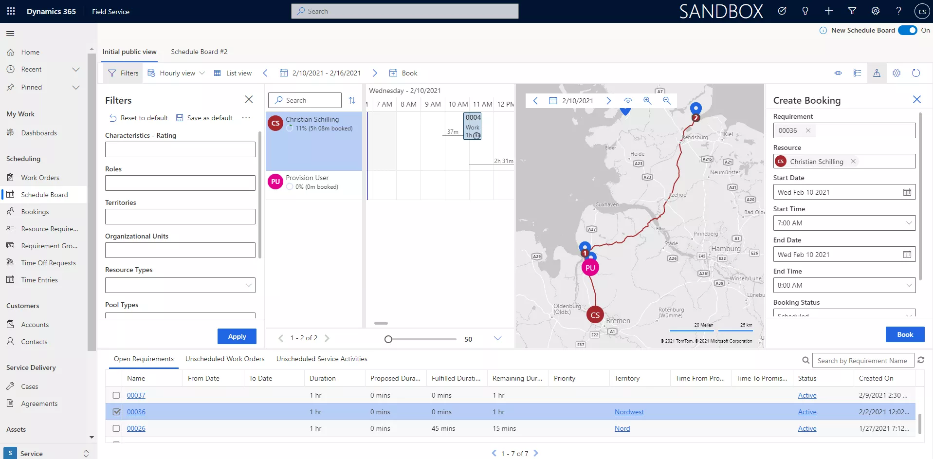 Open Requirements (offene Buchungen) und die Liste der zu planenden Aufträge dienen als Arbeitsvorrat für die Planung. Hier können spezifisch auf Ihre Service-Bedürfnisse gefilterte Ansichten bereitgestellt werden. Aus den Listen, die dort verfügbar sind, können Sie die einzelnen Aufträge / Ressourcenanforderungen buchen.