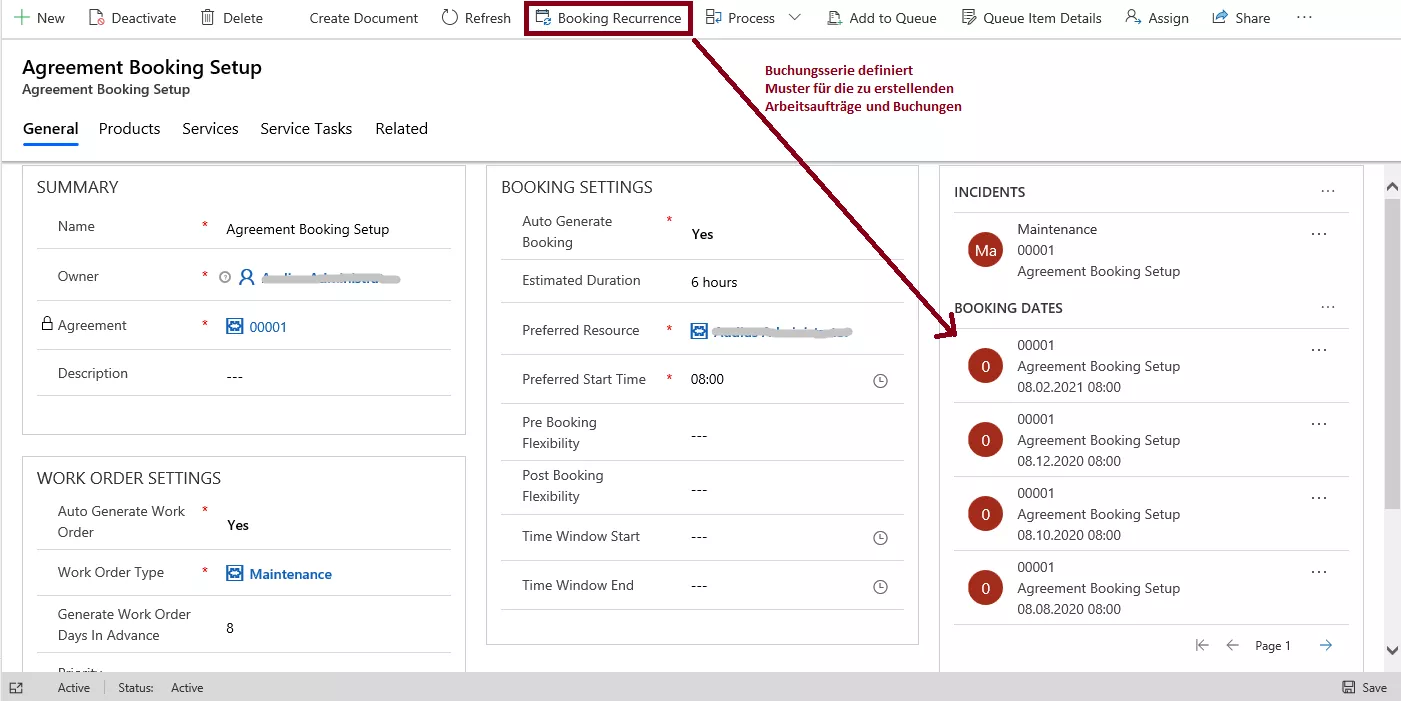 Field Service Vereinbarungen (z.B. Wartungsverträge, Wartungszeitpläne) bieten die Möglichkeit, Arbeitsaufträge und auch Rechnungen mit vordefinierten Details, Häufigkeit und Datumsbereichen automatisch zu generieren.