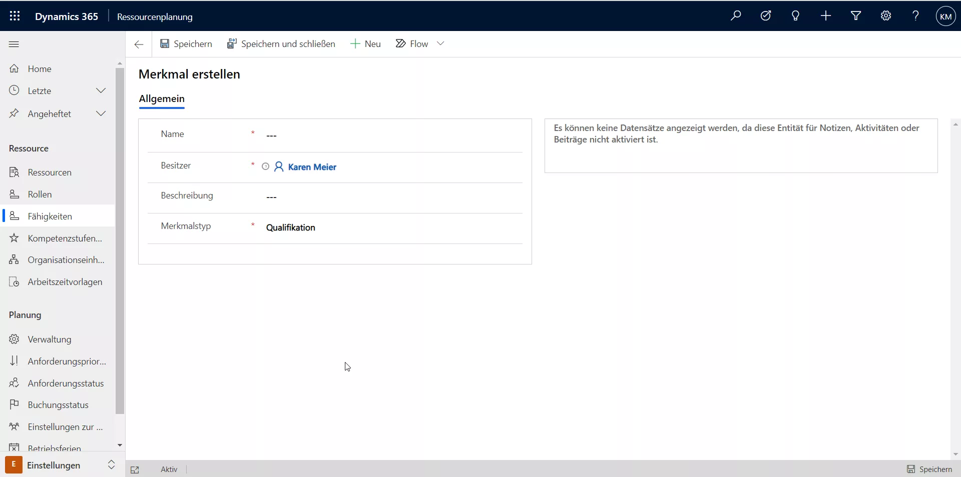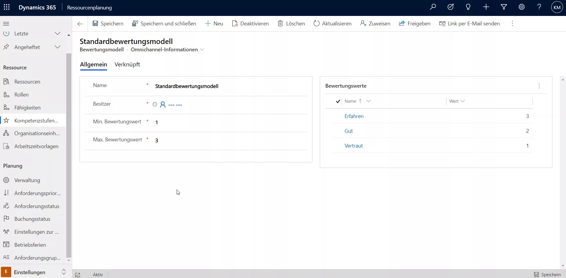 Zudem ist es möglich, andere Bewertungsmodelle zu definieren. An der Ressource können Sie Fähigkeiten / Merkmale mit einer Bewertung hinterlegen: