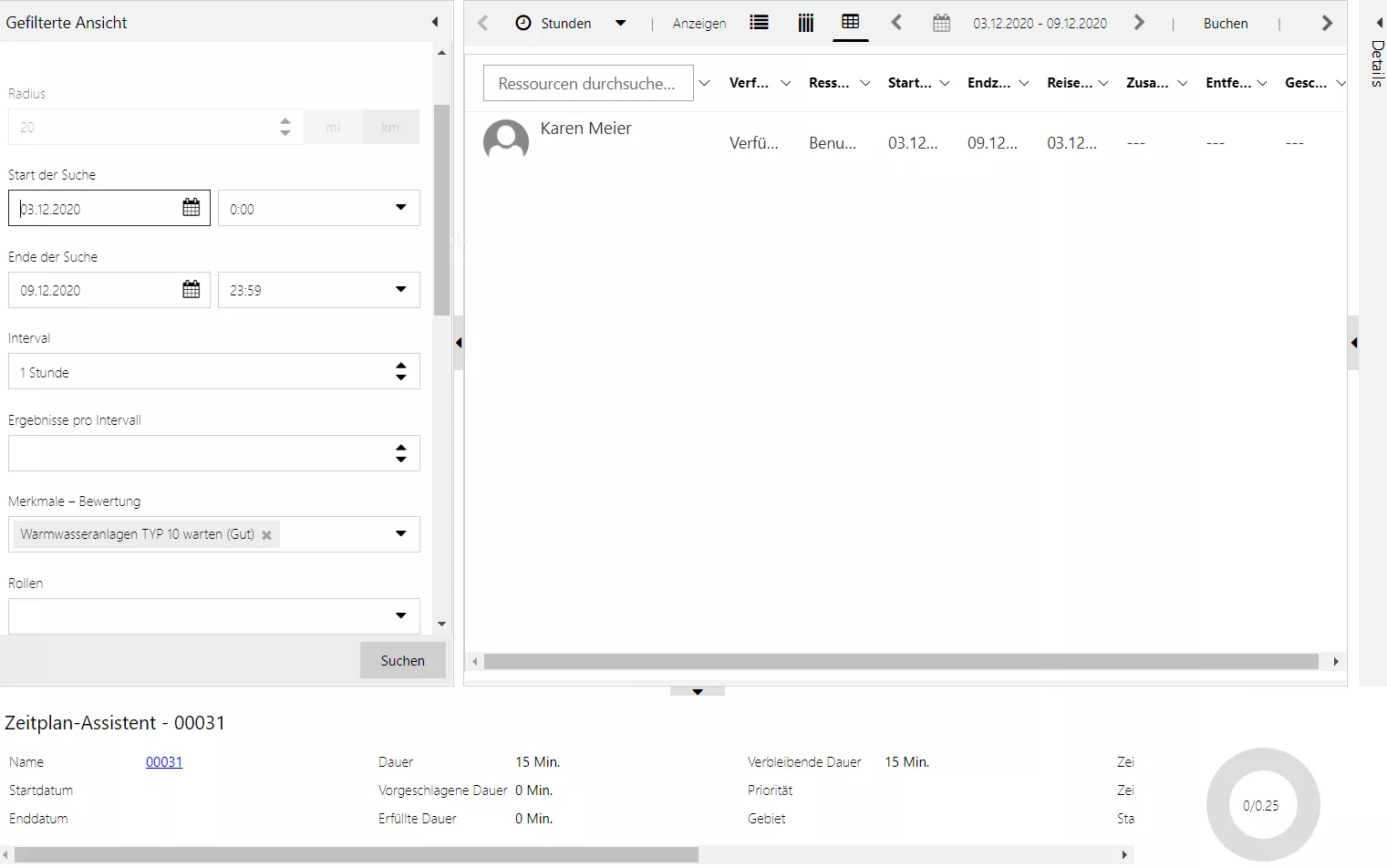 Bei der Buchung des Auftrags wird automatisch der Filter auf das/die erforderliche/n Merkmal/e gesetzt und nur Ressourcen, die über die benötigte Qualifikation verfügen, zur Auswahl angeboten: