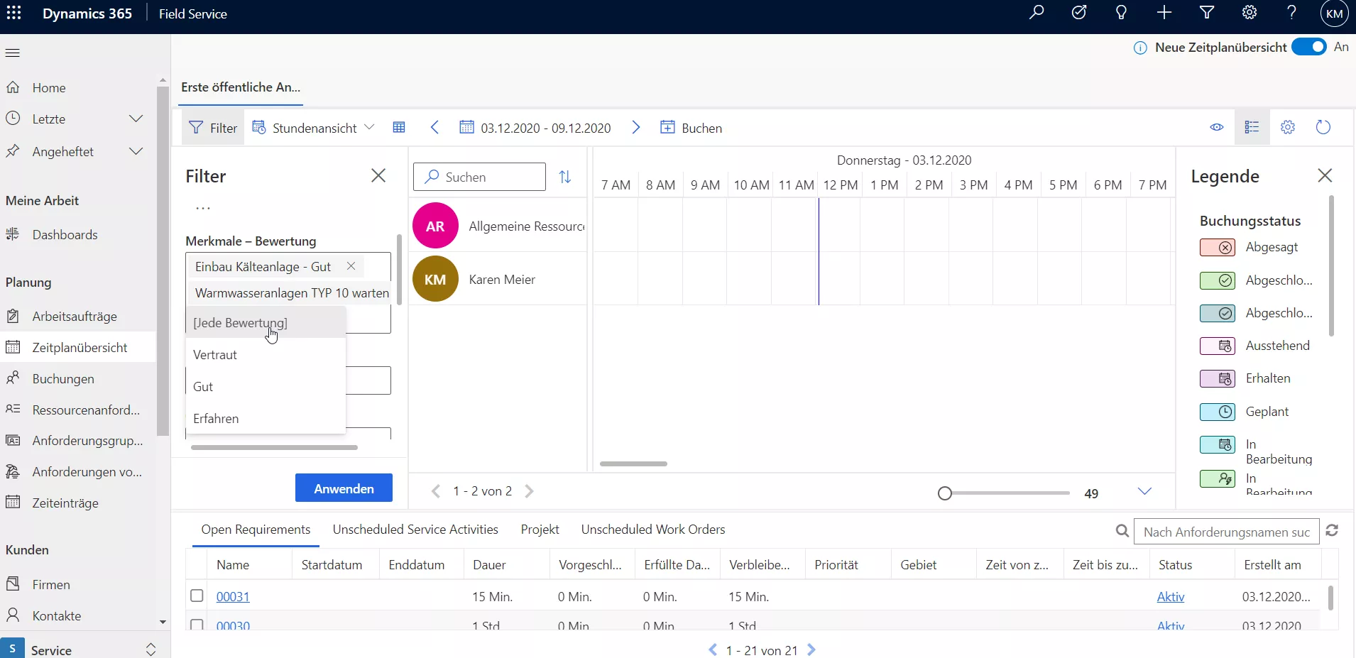 Die Mitarbeiter des Innendienstes können den Merkmal-Filter in der Zeitplanübersicht ebenfalls nutzen, um alle Techniker mit bestimmten Fähigkeiten sowie deren Verfügbarkeit für einen bestimmten Tag zu prüfen.