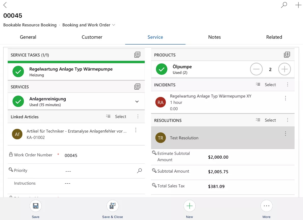 Diese Informationen reichen von den Servicetasks (Arbeitsauftragsserviceaufgaben), über Produkte, Services, Wissensartikel und weitere Auftragsinformationen bis zu den neuen Resolutions: