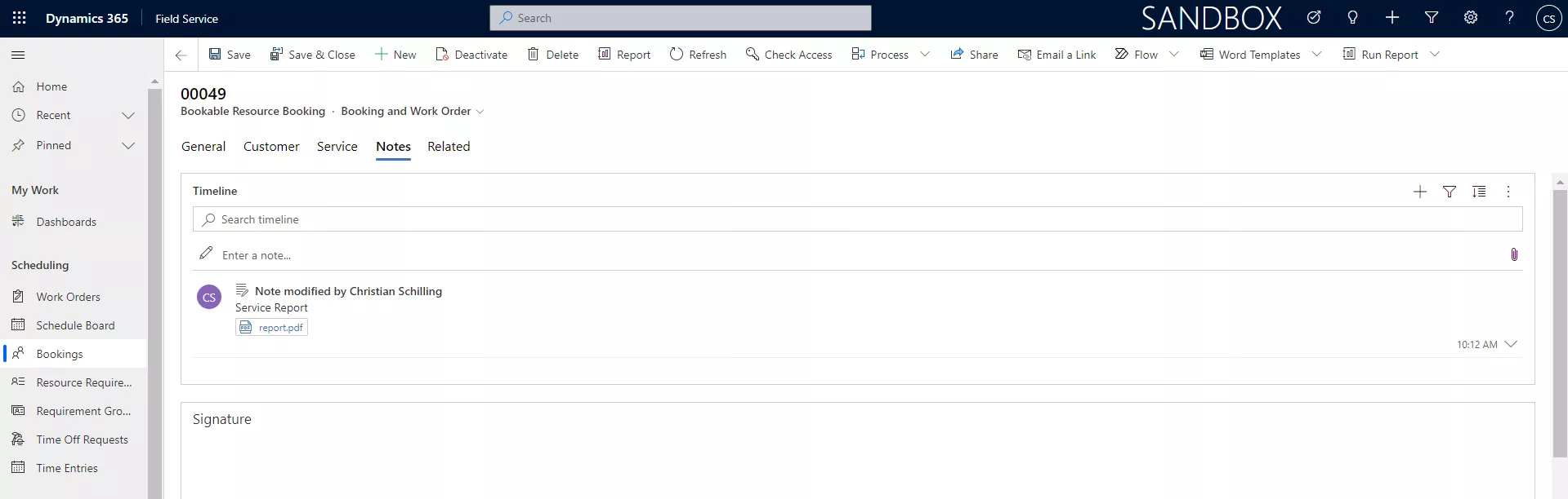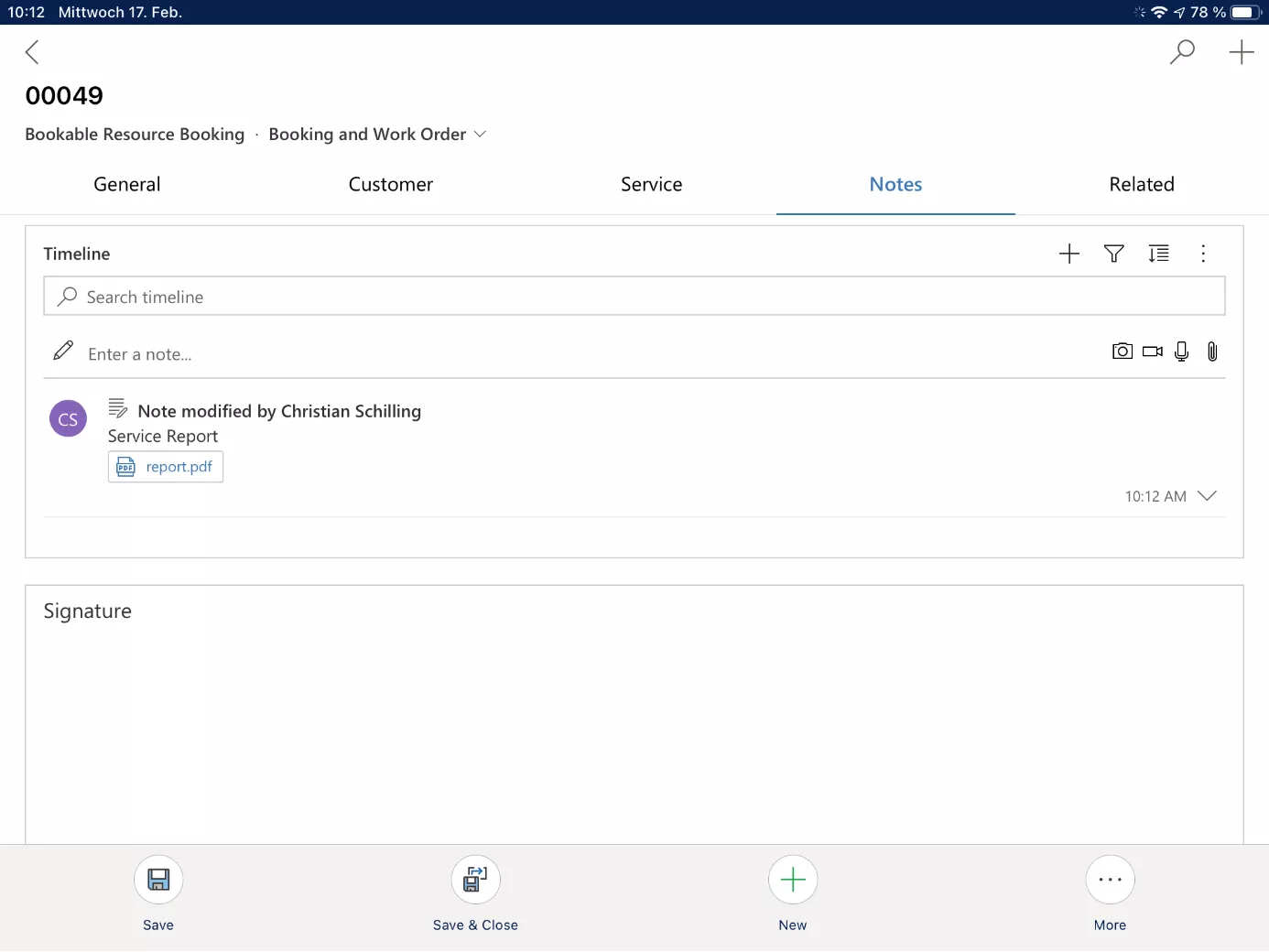 Der Kunde kann den Bericht unterschreiben und es wird ein PDF generiert, das in den Notes angezeigt wird.