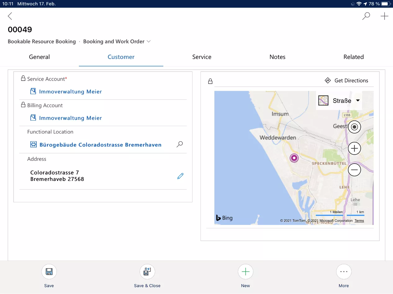 Im Reiter „Customer“ erscheint die Adresse des Einsatzortes, ein Klick öffnet die Navigation: