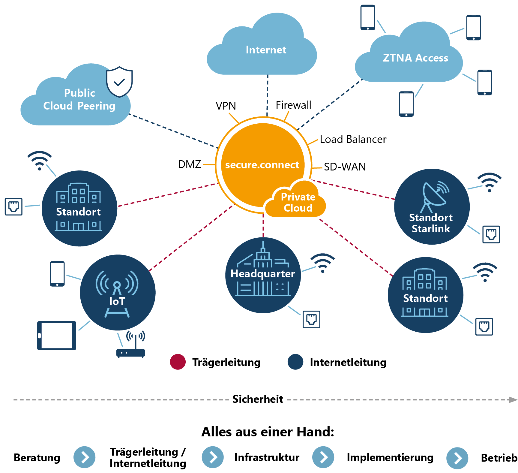 IT-Sicherheit, Fachkräftemangel und steigende Betriebskosten – wir bieten die ganzheitliche Lösung. Alles aus einer Hand: an jedem Standort eine Trägerleitung und ein Internetdienst, kombiniert mit zentral gemanagter Infrastruktur für sichere Anbindungen (IPsec / SD-WAN).