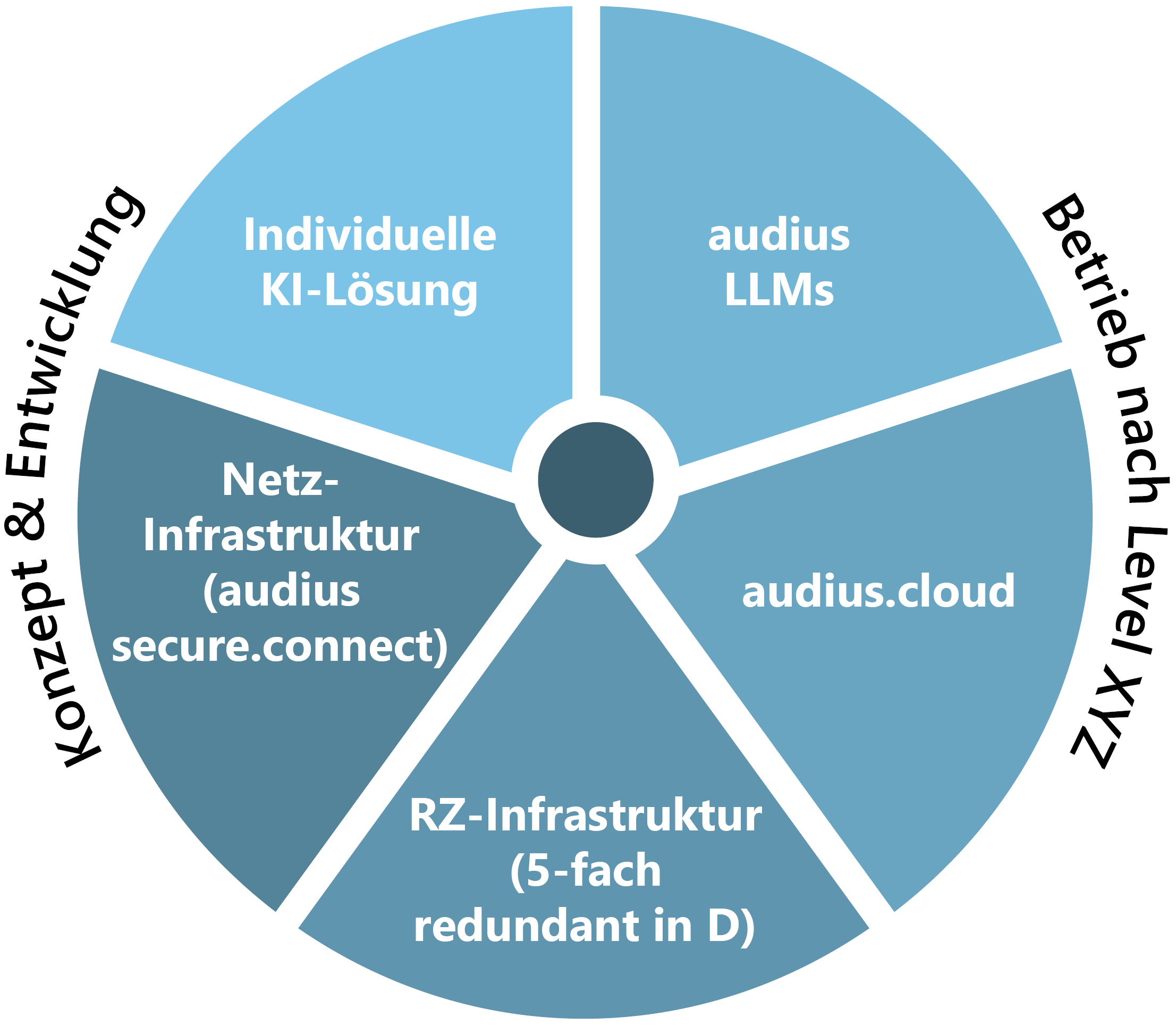 Für echten Mehrwert muss KI auf die Daten und das Wissen Ihres Unternehmens zugreifen können – und das geht nicht mit einer Black Box, bei der Sie nicht wissen, wo Ihre Daten landen. Wir bieten Ihnen Künstliche Intelligenz als Private KI aus der audius.cloud oder on-premises bei Ihnen im Haus. Unser audius Technology Stack basiert auf soliden Technologien und wird in fünf redundanten Rechenzentren in Deutschland betrieben mit eigenem Personal, eigenem Internet Service Provider und – wenn gewünscht – direktem Public Cloud Peering zu AWS, Microsoft & Co. Mehr Vertraulichkeit und digitale Souveränität geht nicht.