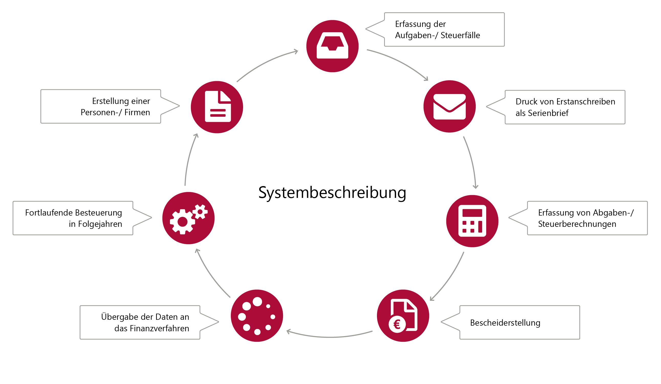 Die Software unterstützt Sie im gesamten Prozess von der Personen-/Firmenverwaltung über die Steuerberechnung und Bescheiderstellung bis hin zur automatischen Übergabe an das jeweilige Finanzverfahren.