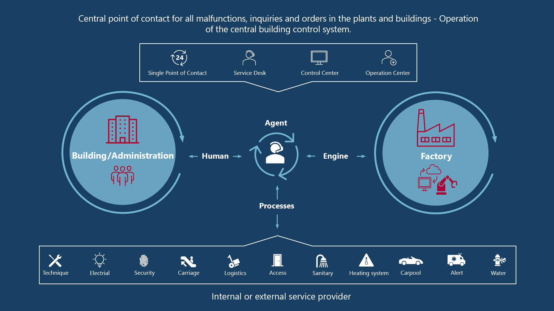 The audius Facility Service Desk is a central point of contact for all disruptions, requests and orders in plants and buildings. We will ensure the smooth running of your plant sites and buildings with top levels of efficiency and quality of service. This includes operating the building automation system, collecting, analyzing and handling incidents plus supervising external service provides in building automation, administration, energy and media supply, disposal and cleaning as well as all other relevant services.